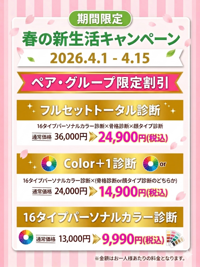 通常12,000円(税込)の16タイプパーソナルカラー診断が、今だけ9,990円(税込)で受けられるため、質の高い診断をお得に体験したい方におすすめです。